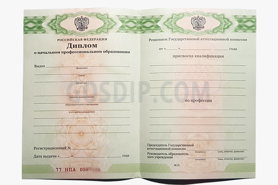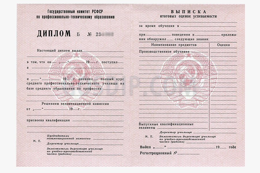 У нас Вы можете купить диплом ПТУ о начальном профессиональном образовании в Санкт-Петербурге. В комплект продажи такого диплома входят: твердая обложка синего цвета, сам бланк и приложение к нему. Документ заполнен в соотнесении с государственными стандартами, установленными Минобрнауки РФ в разные периоды.